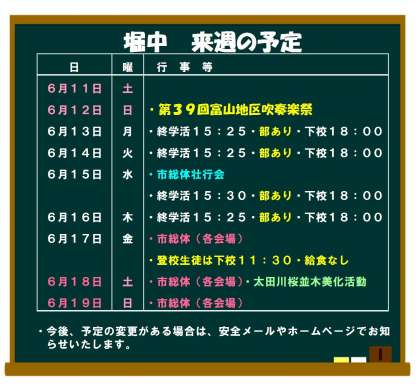 また、文化系部活動は、6月17日(金)は校内で部活動を行った後下校となります。部活動に所属していない生徒は、登校後学年で学習活動等を行います。