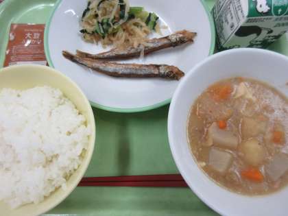 ごはん、大豆ふりかけ、ししゃものから揚げ、はりはり和え、鶏肉とじゃがいものごま煮、牛乳