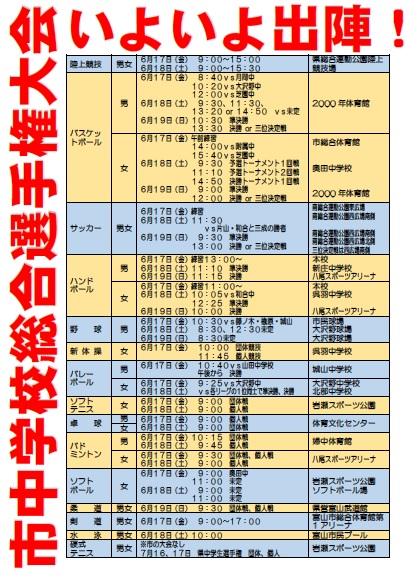 明日6月17日(金)から行われる富山市中学校総合選手権大会の日程一覧です。