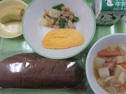 ココアコッペパン、チーズオムレツ、ひよこ豆のオリーブオイル炒め、ポトフ、バナナ、牛乳
