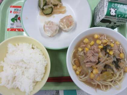 ごはん、野菜ふりかk、かにシュウマイ、大根サラダ、サッポロラーメン、牛乳
