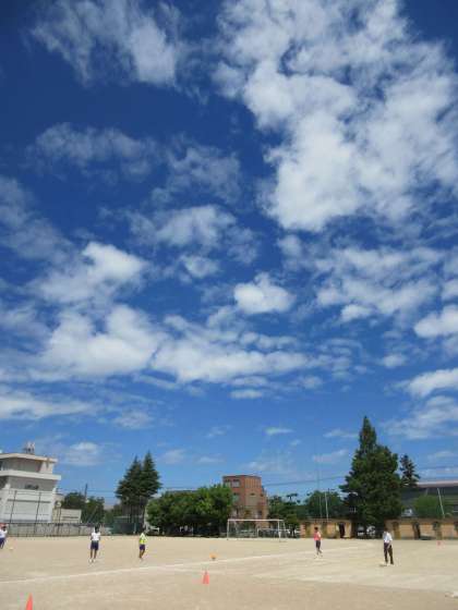 グラウンドの体育の授業では、熱中症予防のため、マスクを外しこまめに休憩を取り、水分補給を行っています。