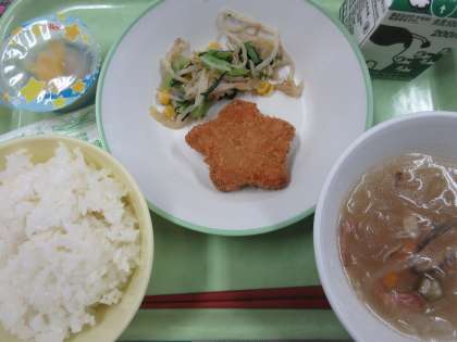 ごはん、星形メンチカツ、コーン和え、天の川スープ、七夕デザート、牛乳