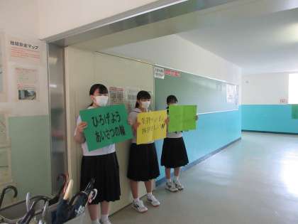 今日も、暑くなりそうです。熱中症予防のため、生徒玄関の中で「足元を固めよう運動」と「あいさつ拡大運動」の呼び掛けを行いました。