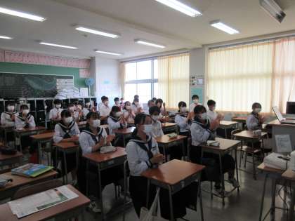 特に、3年生の教室は、手を膝の上に置いて各部の抱負を聞き、笑顔で拍手をおくっていました。