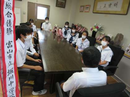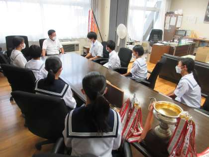 7月12日(火)お昼休みに校長室で、陸上競技部の生徒が大久保校長先生に、県選手権大会の報告を行いました。