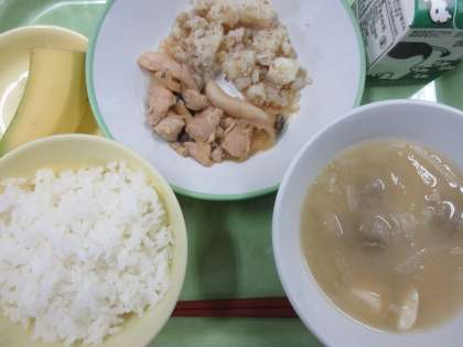 ごはん、あっさりチキン、ごまポテト、つみれ汁、バナナ、牛乳