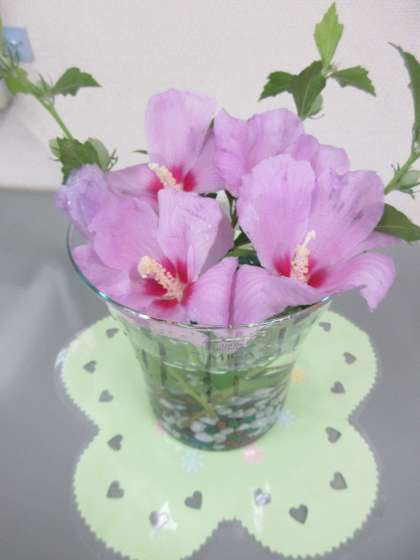 7月13日(水)、本校校庭にあるムクゲの花を摘み、大口花瓶に水を張り花を浮かべるアレンジメントで校長室に飾りました。
