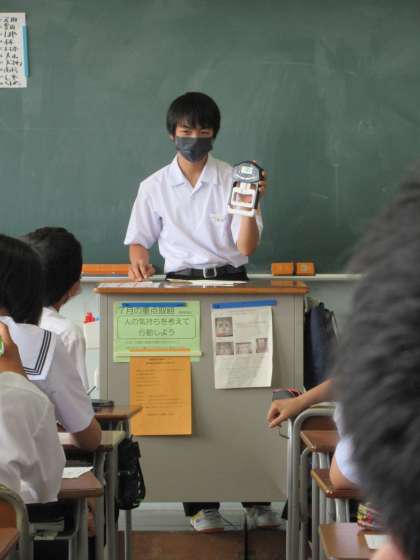中には、お気に入りを握力計を持参して握力測定の実演をする生徒もいました。「58キロ!」という結果に、クラス中が盛り上がりました。