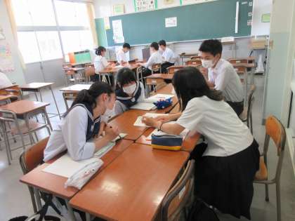 3名の先生方と21名の高校生が来校され、小グループに分かれて問題の解き方や勉強方法、高校生活等についてお聞きしました。参加した中学生からは「問題を解く過程を教えてもらえて楽しかった」「先輩方のようになれるように努力したい」などの感想が寄せられました。
