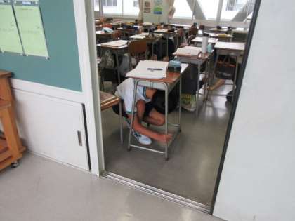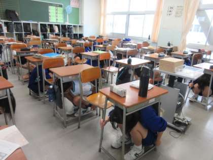 「まず低く」「頭を守り」「動かない」の3つの動作を実践しました。安全確保のために、机の脚をしっかりと押さえていました。