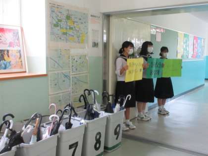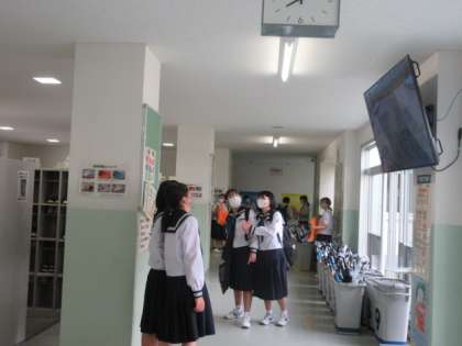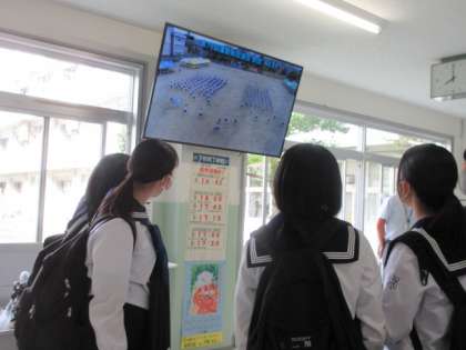 生徒玄関の中では、挨拶拡大運動が繰り広げられ、大型モニターの前には、映し出された昨日の運動会の団演技を観ようと生徒たちが集まっていました。