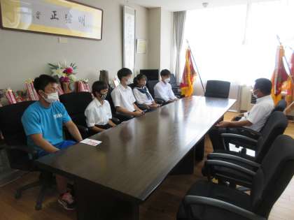 9月14日(水)お昼休みに、校長室で、第77回国民体育大会と全国大会出場選手の激励会が行われました。健闘を期待します。