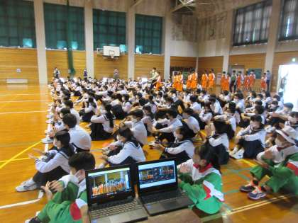 9月14日(水)6時間目に、富山市中学校新人大会と県中学校駅伝競走大会の壮行会が体育館で行われました。体育館には、選手と2年生の生徒が入り、1・3年生の教室にはライブ配信されました。
