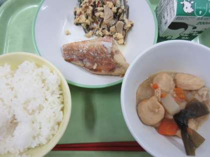 ごはん、赤魚の塩焼き、卵ときくらげの炒め物、炊き合わせ、牛乳