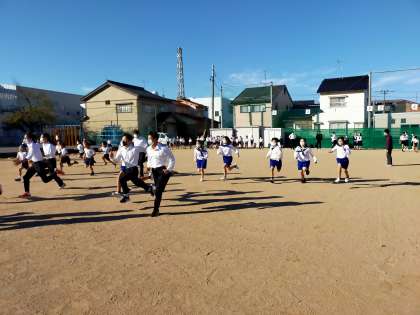 本日は最終日だったので、グラウンドで走っている小学生に混ざって、生徒達も走りました。
