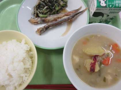 ごはん、ししゃものから揚げ、磯和え、さつま汁、牛乳