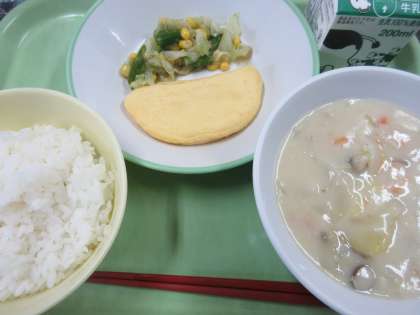 ごはん、オムレツ、アスパラサラダ、秋の香りシチュー、牛乳です。