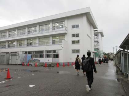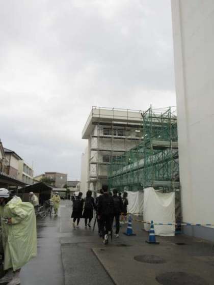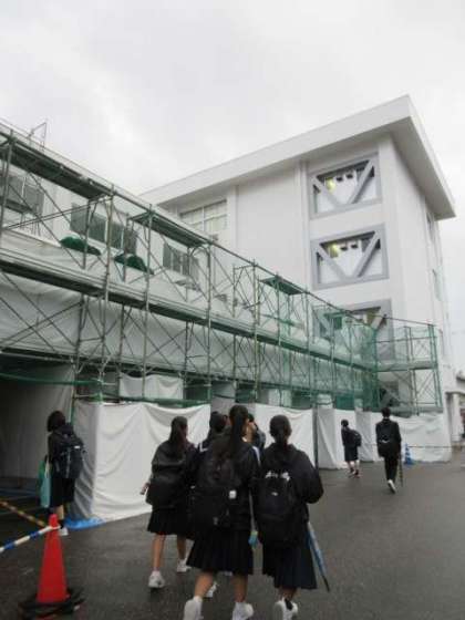校舎の外壁工事の足場が少しずつはずされ、真っ白な校舎が姿を現しました。