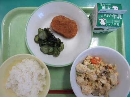 ごはん、牛乳、里芋コロッケ、酢の物、炒り豆腐です。