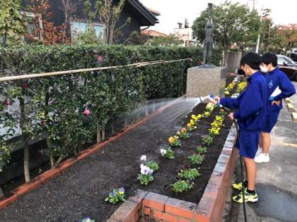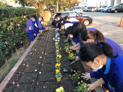 美化委員会で花壇の植え替えを行いました。ビオラ、パンジー、チューリップの球根です。