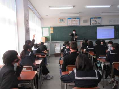 元気いっぱいな生徒が多く、授業に関係あること・ないこと、たくさんの質問をいただきました。左下の写真はその風景です。お話してくれた皆さん、ありがとうございます!(週末はテスト勉強をがんばってくださいね。)