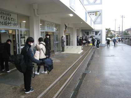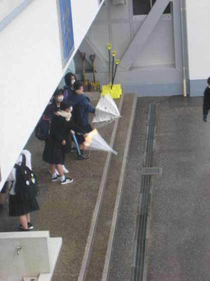 生徒玄関前で傘の雨を落とす生徒たち。