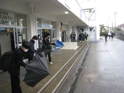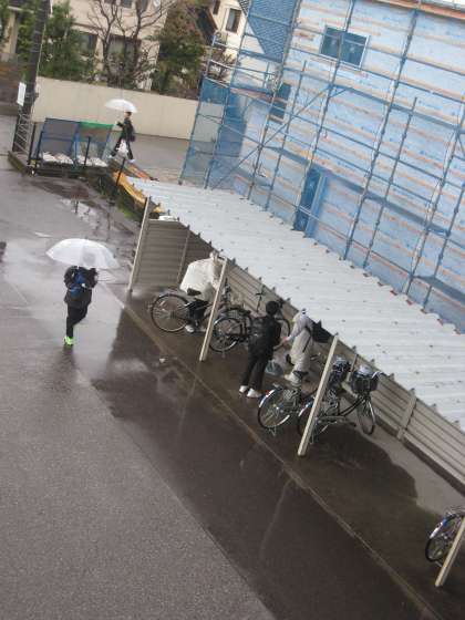 リュックを担いだ上から合羽を着ている自転車通学生、傘の雨を落とす徒歩通学生、どちらも雨の対策がしっかりできていますね!