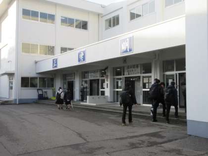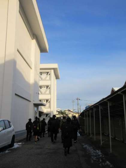 12月21日(水)、今朝は昨日までの天候と違って晴れ間がのぞきました。路面は凍結しており、生徒が凍った路面の雪を砕きながら歩く音が響いていました。