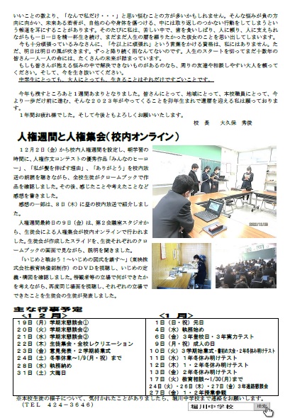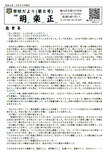 昨日12月20日(火)、学校だより第8号を配布しました。