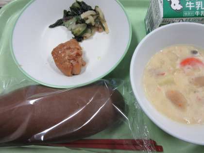 ココアコッペパン、てりやきチキン、海藻サラダ、豆ときのこのクリーム煮、牛乳です。