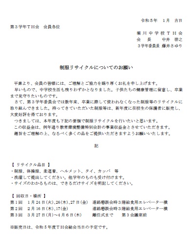 1月17日(火) 制服リサイクルの依頼(3学年保護者様)