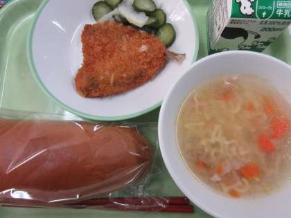 黒糖コッペパン、アジフライ、あぶのサラダ、マカロニスープ、牛乳です。