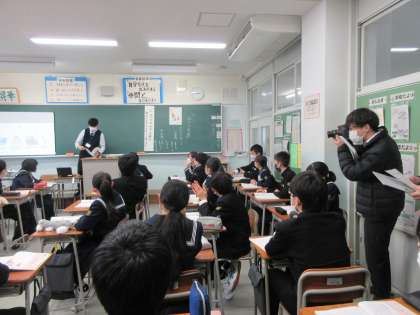 2年6組の授業の様子を撮影し、3年生の代表生徒へ「マスクについて」質問していました。