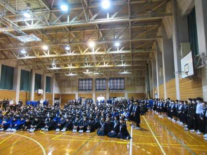 給食の時間に放送で告知したところ、約600名の生徒が鑑賞しました。最後に、生徒代表藤井くんから感謝の言葉がありました。