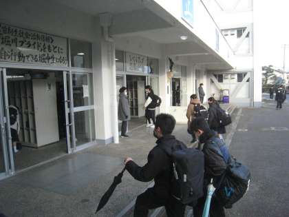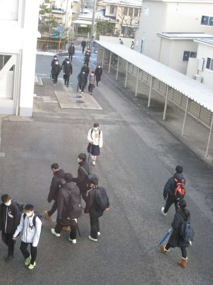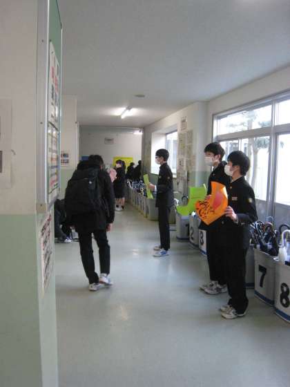 所々凍った路面に気を付けながら登校する生徒たち。生徒玄関前廊下では「足元を固めよう運動」の呼びかけを元気に行っていました。