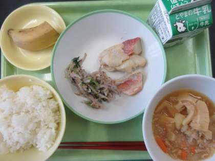 ごはん、赤魚の塩焼き、ゆかり和え、豚肉とじゃがいものうま煮、バナナ、牛乳