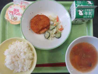 ごはん、チーズクロケット(チーズ入り一口コロッケ)、ジュリエンヌサラダ(せん切り野菜のサラダ)、ブイヤベース(魚介の寄せ鍋スープ)、ブラマンジェ、牛乳