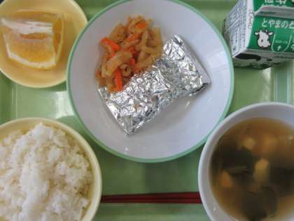 ごはん、さばの銀紙焼き、大根のきんぴら、すまし汁、河内晩柑、牛乳