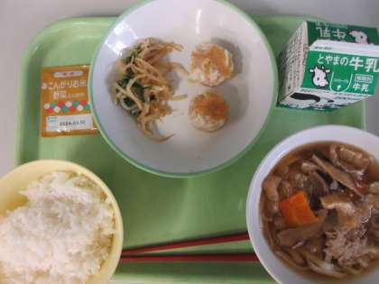 ごはん、かやくうどん、にんじんシューマイ、おひたし、野菜ふりかけ、牛乳