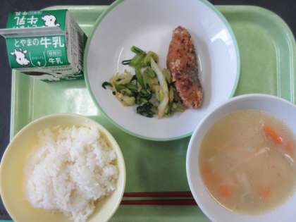 ごはん、魚の竜田揚げ、小松菜ひたし、呉汁、牛乳