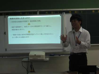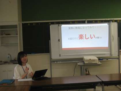 放課後に、今年度から教員として教壇に立っている二人が、「教員の魅力」について教育実習生に語る研修会を行いました。