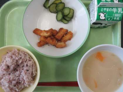 雑穀入りごはん、2色ピクルス、いかのかりん揚げ、すいとん、牛乳