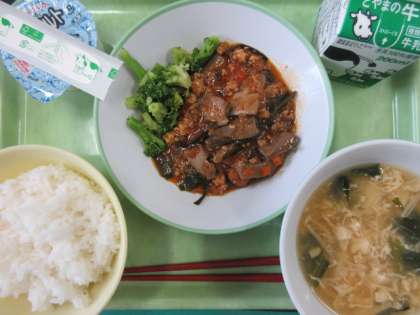ごはん、ゆでブロッコリー、もりもりマーボー丼、かきたま汁、牛乳、ヨーグルト