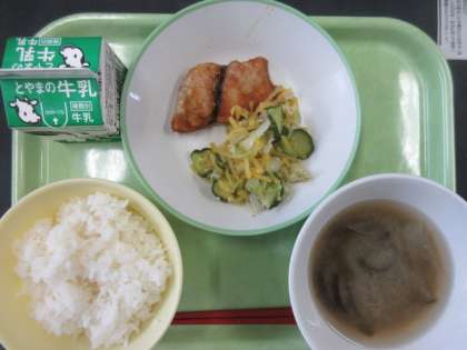 ごはん、あわせ和え、揚げ魚のレモン味、具だくさん汁、牛乳