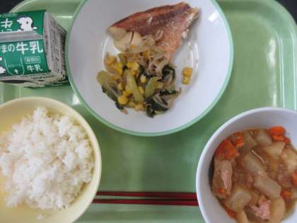 ごはん、チンゲンサイソテー、赤魚の塩焼き、鶏肉とじゃがいものごま煮、牛乳