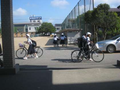 朝の生徒玄関では、規律委員がポスターを持って挨拶をしていました。