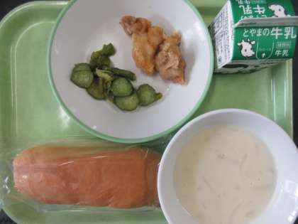 コッペパン、アスパラサラダ、フライドチキン、ビーンズポタージュ、牛乳