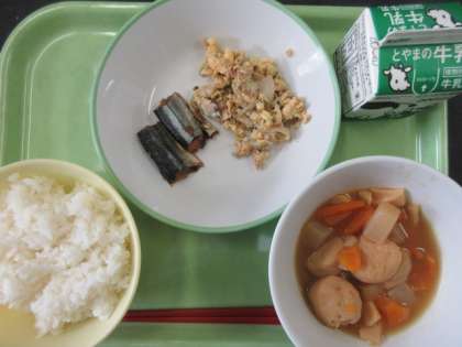 ごはん、炊き合わせ、ベーコンとゴーヤの卵炒め、さんまの生姜味、牛乳