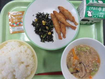 ごはん、ひじきのごま和え、わかさぎのフリッター、野菜ふりかけ、冬瓜のそぼろあん、牛乳